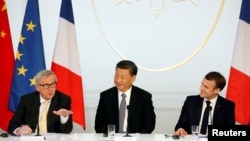 Fransa Cumhurbaşkanı Emmnauel Macron, Almanya Başbakanı Angela Merkel ve AB Komisyonu Başkanı Jean-Claude Juncker, Çin Devlet Başkanı Xi Jinping'le dünyanın büyük sorunlarının "çok taraflı bir işbirliği ve diyalogla" çözülmesi konusunda anlaştıklarını açıkladı. Macron, Yeni İpek Yolu Projesi'yle Avrupa’yla ticaret hacmini geliştirmek isteyen ve bunun için AB içindeki bölünmeye oynayan Xi Jinping’e "Hiçbirimiz saf değiliz. Çin’e saygı duyuyoruz. Çin’den de Avrupa'nın birliğine ve değerlerine saygı duymasını bekliyoruz" mesajı verdi. Xi Jinping de, "AB ve Çin'in düşman ve rakip değil, diyalog ve ticari rekabet içinde olan iki partner olarak ilişkilerini güçlendirmesinden yana olduğu" yanıtı verdi.