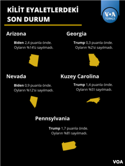 ABD Başkanlık seçiminin kazananı 270 Seçici Kurul üyesinin oyunu alan aday olacak. Şu anda Demkorat aday Joe Biden 253, Cumhuriyetçi aday Donald Trump ise 214 delegeyi kazanmış görünüyor. ABD Başkanlık seçimlerinde sonucu adayların başabaş gittiği bir dizi eyalet belirleyecek. Bu eyaletler Arizona, Georgia, Nevada, Kuzey Carolina ve Pennsylvania.
