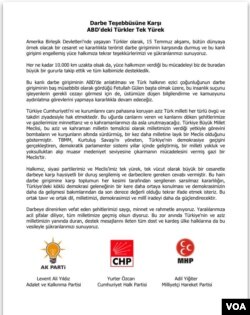 AK Parti, CHP ve MHP temsilcileri tarafından hazırlanan ortak bildiri şöyle denildi; “Amerika Birleşik Devletleri’nde yaşayan Türkler olarak, 15 Temmuz akşamı, bütün dünyaya örnek olacak bir cesaret ve kararlılıkla terörist darbe girişiminin karşısında durmuş ve bu kanlı girişimi engellemiş yüce halkımıza tekrar teşekkürlerimizi ve şükranlarımızı sunuyoruz. Her ne kadar on bin kilometre uzakta olsak da, yüce halkımızın verdiği bu mücadeleyi biz de buradan büyük bir gururla takip ettik ve tüm kalbimizle destekledik. Bu kanlı darbe girişiminin ABD’de anlatılması ve Türk halkının ezici çoğunluğunun darbe girişiminin baş müsebbibi olarak gördüğü Fethullah Gülen başta olmak üzere, bu insanlık suçunu işleyenlerin gerekli cezayı görmesi için de, üstümüze düşen bilgilendirme ve kamuoyunu aydınlatma görevlerini yapmaya kararlılıkla devam edeceğiz.