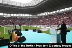 Erdoğan konuşmasının ardından, bakanlar ve eski milli futbolcular arasında oynanan futbol karşılaşmasının başlama vuruşunu yaptı.