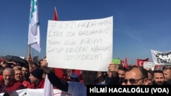 Mustafa Çunkuş ve Mustafa Memiş ikisi de işçi. İkitellli’den gelmişler eyleme. Taşıdıkları dövizde, “EYT bizim hakkımız, AKP ve MHP hakkımızı verin, uyuma hakimler yargı, emekçinin hakkını verin” yazıyor.