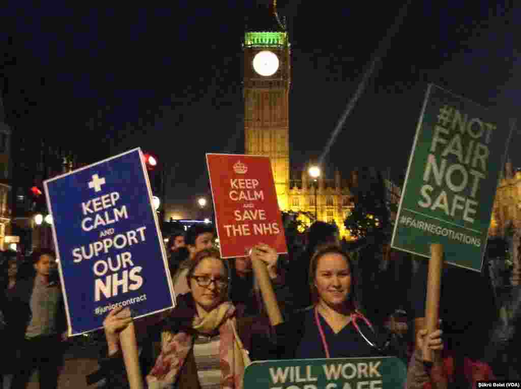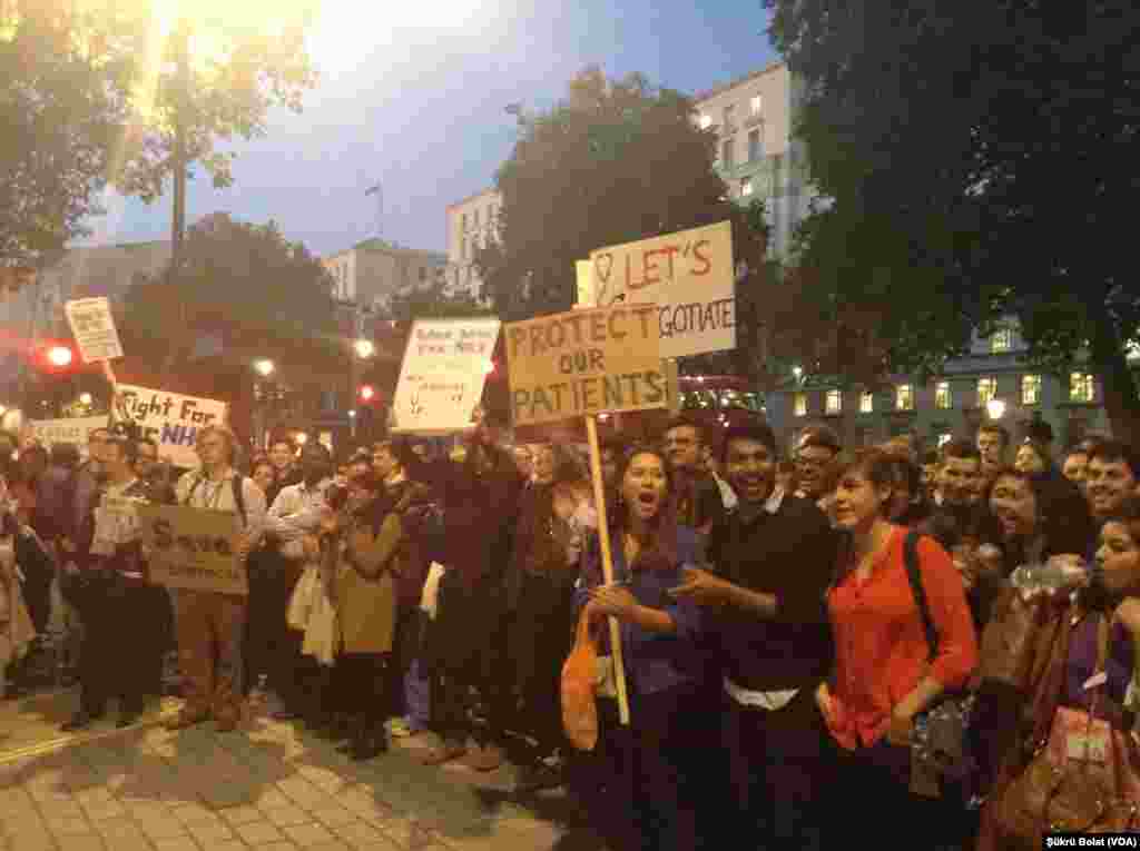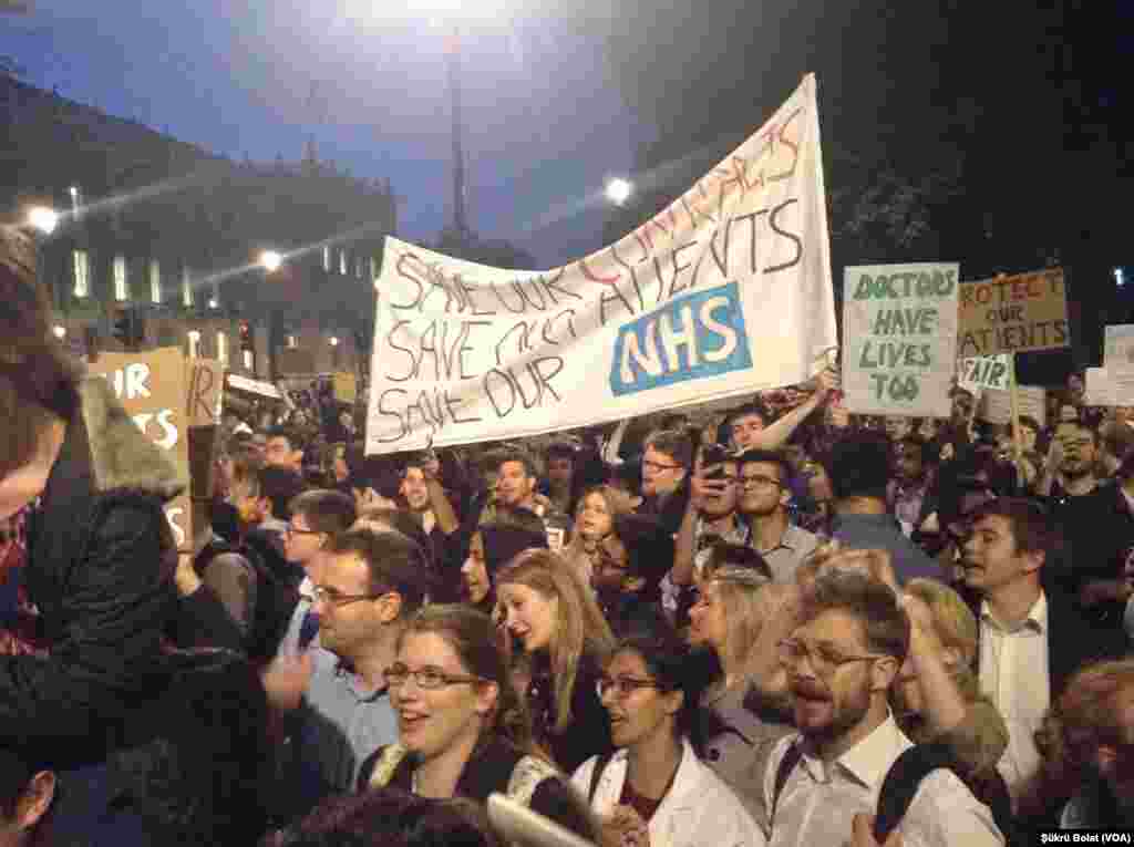 İngiltere'de Muhafazakar Parti hükümetinin uyguladığı politikalar nedeniyle sağlık sektöründeki kriz giderek büyüyor. Doktorlar, beceri ve yeteneklerini kullanamayacakları alanlarda ve fazla mesai verilmeden çalışmaya zorlanmalarını Londra'da protesto etti