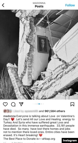 Madonna, Instagram sayfasında yaptığı paylaşımda, “Herkes sevgililer gününde aşktan bahsediyor. Tüm sevgimizi ve iyileştirici enerjimizi, Türkiye ve Suriye’deki yıkıcı depremde büyük kayıplar yaşayanlar gönderelim. Birçok kişi evlerini ve işlerini kaybetti, sevdiklerini kaybettiklerini söylemeye gerek dahi yok. Şehirler tamamen yok oldu. Bu çok üzücü bir durum” ifadelerini kullandı.