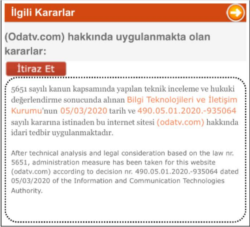 Kararda, "5651 sayılı kanun kapsamında yapılan teknik inceleme ve hukuki değerlendirme sonucunda alınan Bilgi Teknolojileri ve İletişim Kurumu'nun 05/03/2020 tarih ve 490.05.01.2020.-935064 sayılı kararına istinaden bu internet sitesi (odatv.com) hakkında idari tedbir uygulanmaktadır" denildi.