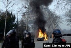 Paris'teki gösterilerde ikinci şiddet sahnesi, akşam 16.30 sularında, kortejin, yürüyüşün son durağı Eyfel Kulesi önündeki Champs de Mars'a ulaşmasıyla yaşandı. Bir grup gösterici otobüs duraklarını kırdı, polise sert cisimler attı, banka ve mağaza vitrinlerinin camlarını kırmaya ve araçları yakmaya başladı. Bir grup da meydanda parkeden ve Paris'i koruyan askerlere ait bir devriye aracını ateşe verdi. Polis, şiddet eylemleri gerçekleştiren göstericilere biber gazı, ses bombası ile tartışmalı flash ball ve parça tesirli gaz bombasıyla müdahale etti. Şiddetli çatışmalar yerel saatle akşam 19.00 sularında göstericilerin dağılması ve gözaltılar ile sona erdi.