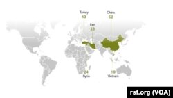 Rapora göre, halen Çin'de 52, Türkiye'de 43, Suriye'de 24, İran'da 23 ve Vietnam'da 19 gazeteci hapishanede. Dünyadaki tutuklu gazeteciler sayısının yarısının bu 4 ülkede bulunduğuna dikkat çeken RSF, Çin ve Türkiye'nin bu yıl da gazeteciler için dünyanın en büyük cezaevi olduğunu dile getirdi.