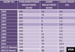 Kadınlar, 7 Haziran seçimiyle birlikte yüzde 17,6 oranında milletvekili oranıyla ilk kez Türkiye tarihindeki en yüksek oranda temsil hakkını yakaladı. 1 Kasım’da yüzde 14,7 kadın vekil oranıyla yeniden 2011 yılındaki temsil oranına düştü. TBMM’de şu anda 26.Dönem’de 81 kadın milletvekili görev yapıyor.