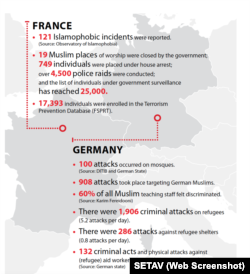 Amerika’nın Sesi’nin incelediği SETAV’ın raporunda ise, pek çok Avrupa ülkesinde İslamfobi kaynaklı nefret suçlarına ilişkin ayrı kayıt tutulmaması eleştirildi. Raporda, Avrupa Birliği (AB) kayıtları itibariyle sadece yüzde 12 oranında Müslümanlarca ilgili otoriteler aleyhine şikayette bulunulduğunu da belirtilerek, bunun da Avrupa ülkeleri ve sivil toplumu tarafından konuya ilgisizliği gösterdiği anlatıldı.