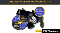 2022 Venezuela Şiddet Raporu’na göre Güney Amerika ülkesinde geçen yıl 9 bin 367 kişi öldürüldü. Raporda dikkat çeken veriler arasında maktullerin 1240'ının güvenlik güçlerine direndikleri gerekçesiyle yaşamını kaybetmesi ve 5 bin 799 cinayetinse faili meçhul olması yer alıyor. Hesaba kayıplar da eklendiğinde rakam 10 bin 737’ye ulaşıyor.