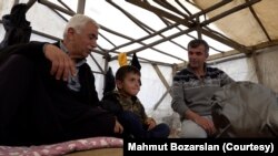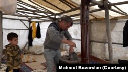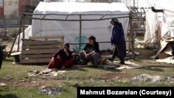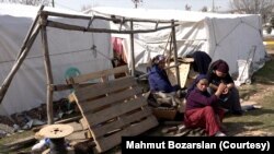 Tüm başvurularına rağmen çadır alamayan aile, daha önce tütün sardıkları brandalarla kamların üstünü örterek çadıra dönüştürdü. Kendi imkanlarıyla yaptıkları çadırı VOA Türkçe'ye gezdiren İmam Songül, brandadaki tütün izlerini gösteriyor.